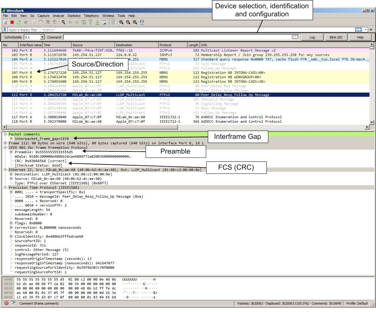 Example Wireshark session. Now you observe packet direction, SFD, FCS, ...
