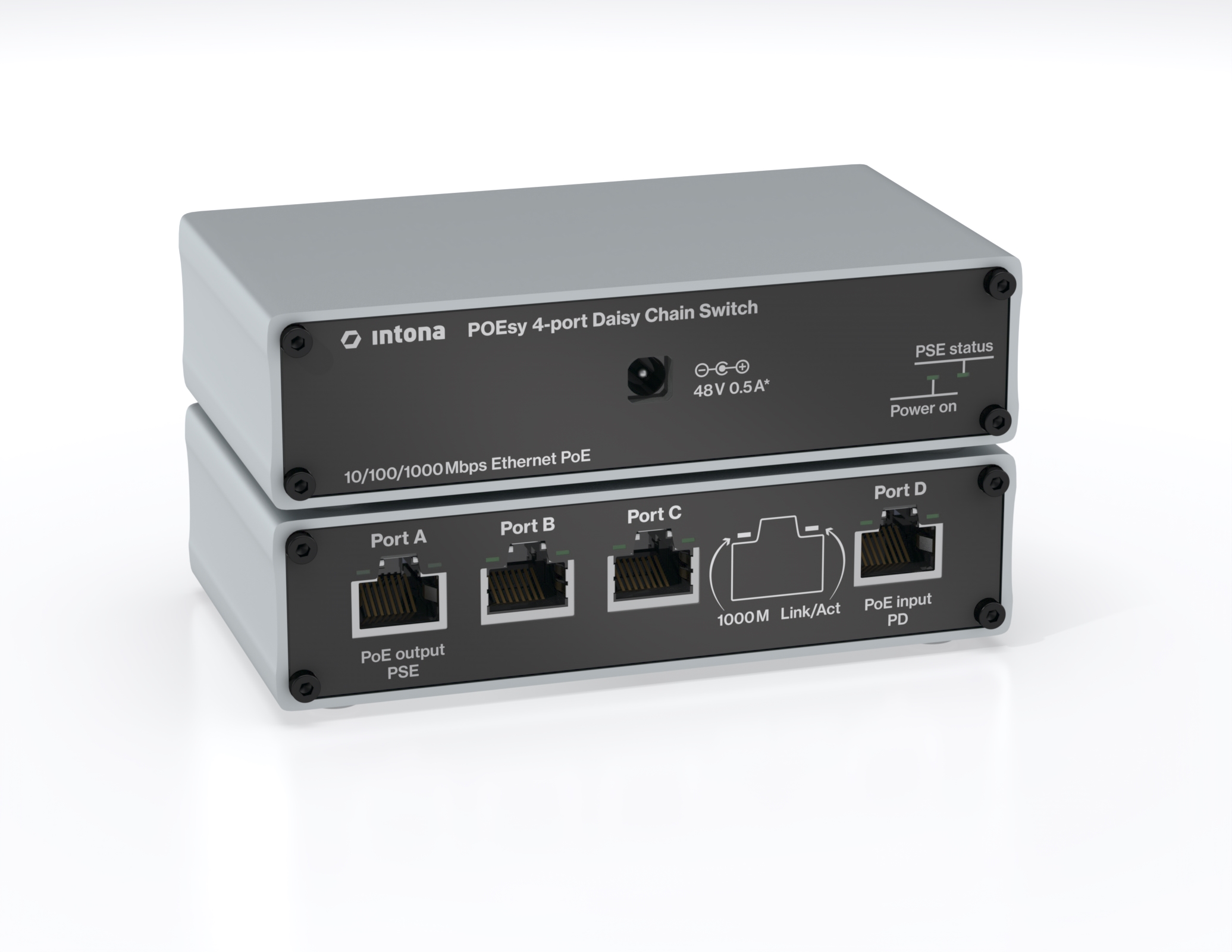 4-port Daisy Chain Switch. Powered by either POE or DC 5.5/2.1 connector. Provides POE as well.