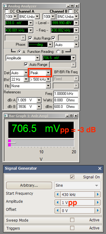 So, the System Two offers selectable measurement bandwidths of 20 kHz, 80 kHz and 430 kHz. This can be mixed up easily, so always have a look on the "BW" setting when reading the amplitude.