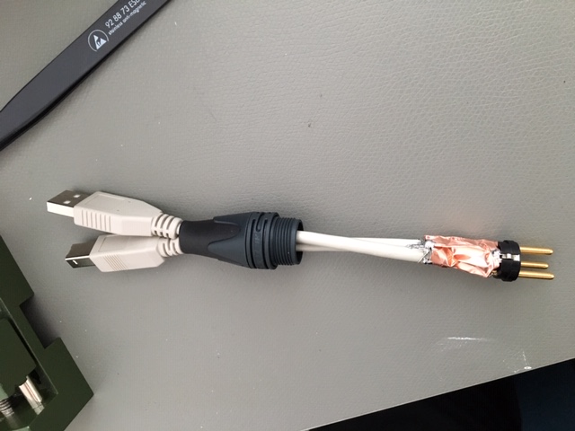 The data lines D+/D- are untouched, the VBUS is tapped and tied to XLR pin 2, GND to pin 3. The shielding is wrapped, soldered all around to copper tape and to pin 1 and the shell. Of course, there is some isolation below the copper tape.