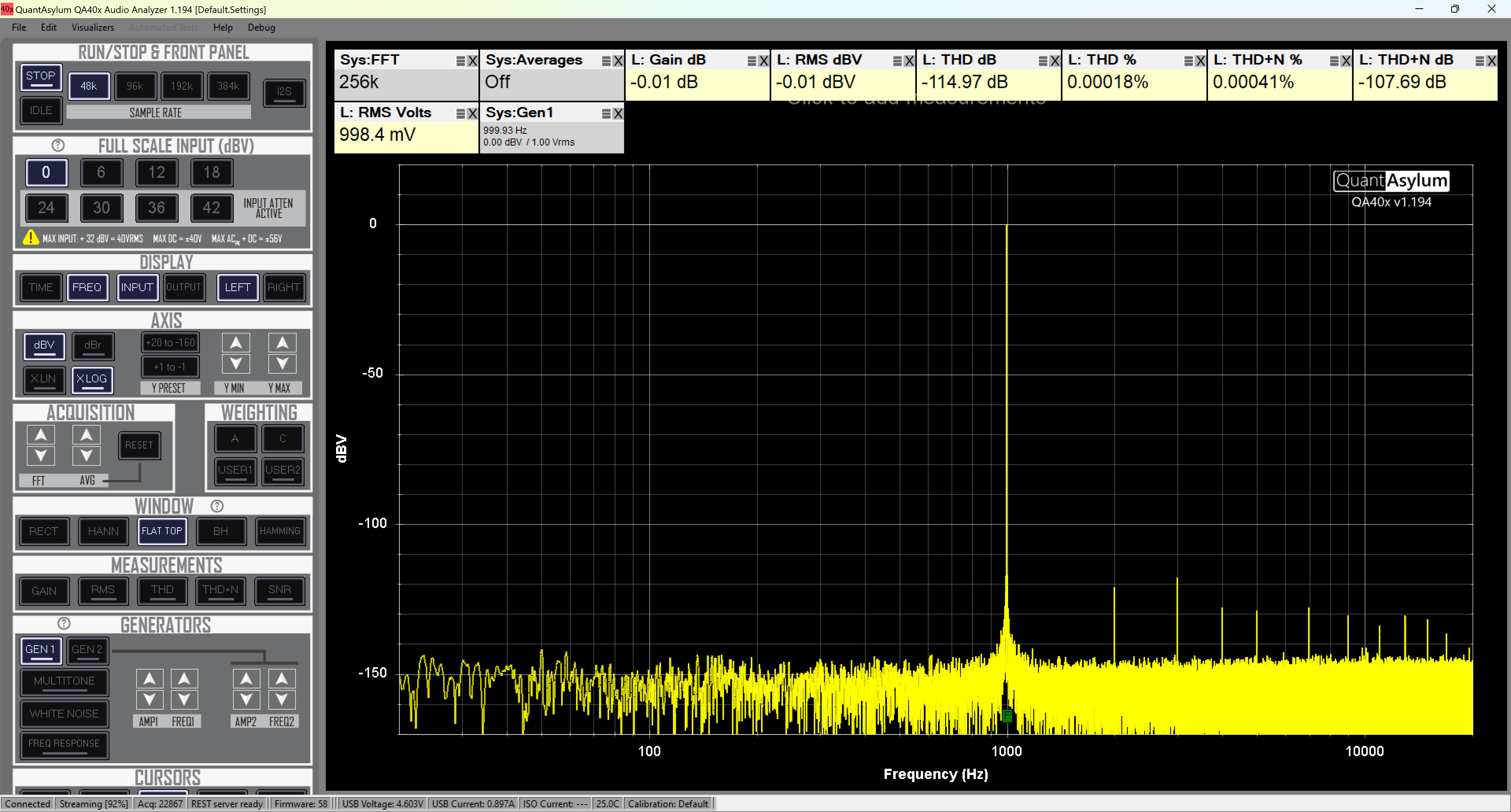 I am using a QA403 audio analyzer (USB 2) and it reports USB voltage and current (and warns if USB voltage is too low). With my PC, USB voltage is around 4.7V and the current between 0.8-0.9A. I see a very minor 50Hz component when looking at the FFT of its output and I wondered if this can be eliminated with 7055-C. I tried connecting it in various ways and giving AUX power with different things (USB hub, USB charger, USB battery etc.) but QA403 always reports the USB voltage below 4.5V when 7055-C is in between. Is this an expected behavior ?